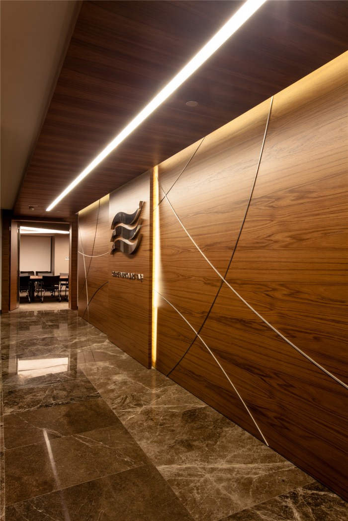 以前最常用的一種方式,一般是現(xiàn)場施工,先將木芯板制作成型,然后將防火板用強力膠貼面。因現(xiàn)在市面上中低檔防火板使用過程中極易破損,一年后極易和木芯板發(fā)生脫離,對強力膠的質(zhì)量和施工人員的技術(shù)要求相對較高,所以這種方式現(xiàn)較少采用。但現(xiàn)有些進口或合資中的高檔品牌防火板的特殊紋路和質(zhì)感確實讓人喜歡,而且防火板有可以無縫拼接的優(yōu)勢,因此有些公司寧不惜高價采用這種方式,也是一種不錯的選擇!
