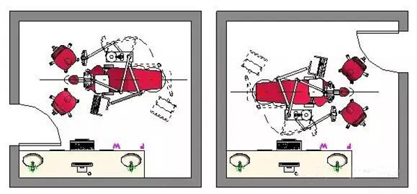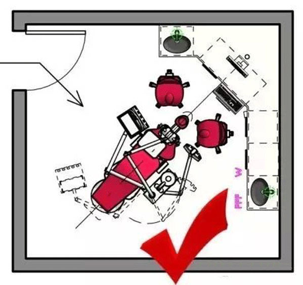 關(guān)于牙椅設(shè)備的擺放原則一是 病人進(jìn)入診室,坐上牙椅的路程最短為佳,二是盡量避免患者腳端直接對(duì)著門的方向,病人隱私差,不安情緒強(qiáng)。如下圖:
